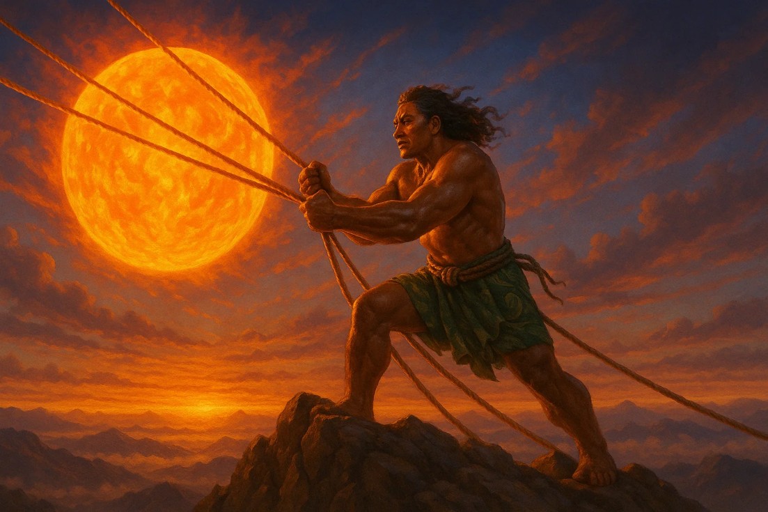 Next time you enjoy a lazy afternoon or a golden sunset, think of Māui—rope in hand, holding back the sky. Because of him, we don’t just chase the sun… we share its time.